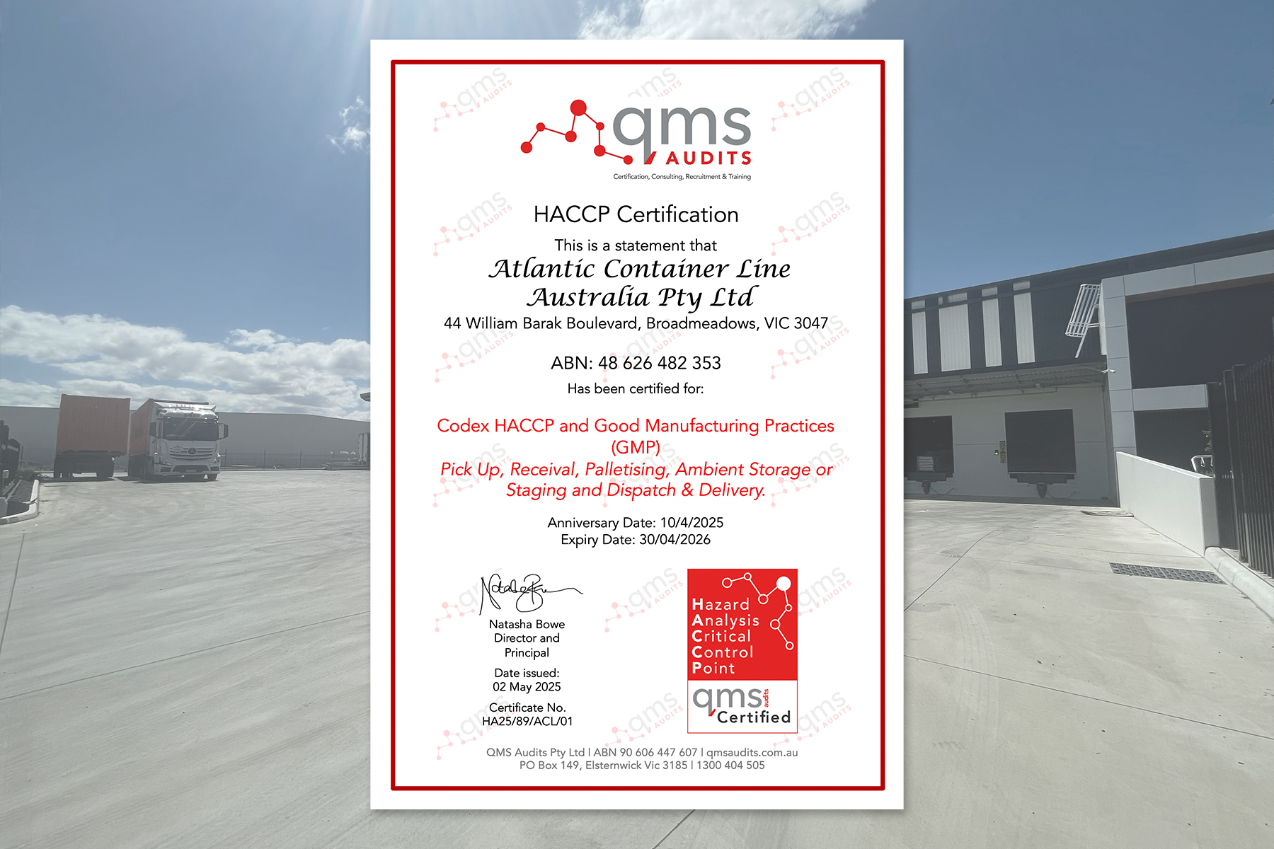 We are proud to announce that we are HACCP compliant. Whether you’re transporting or storing fresh, packaged food, you can rely on ACL Australia to keep your supply chain safe and efficient. We are committed to ensuring our compliance and prioritising safety standards.