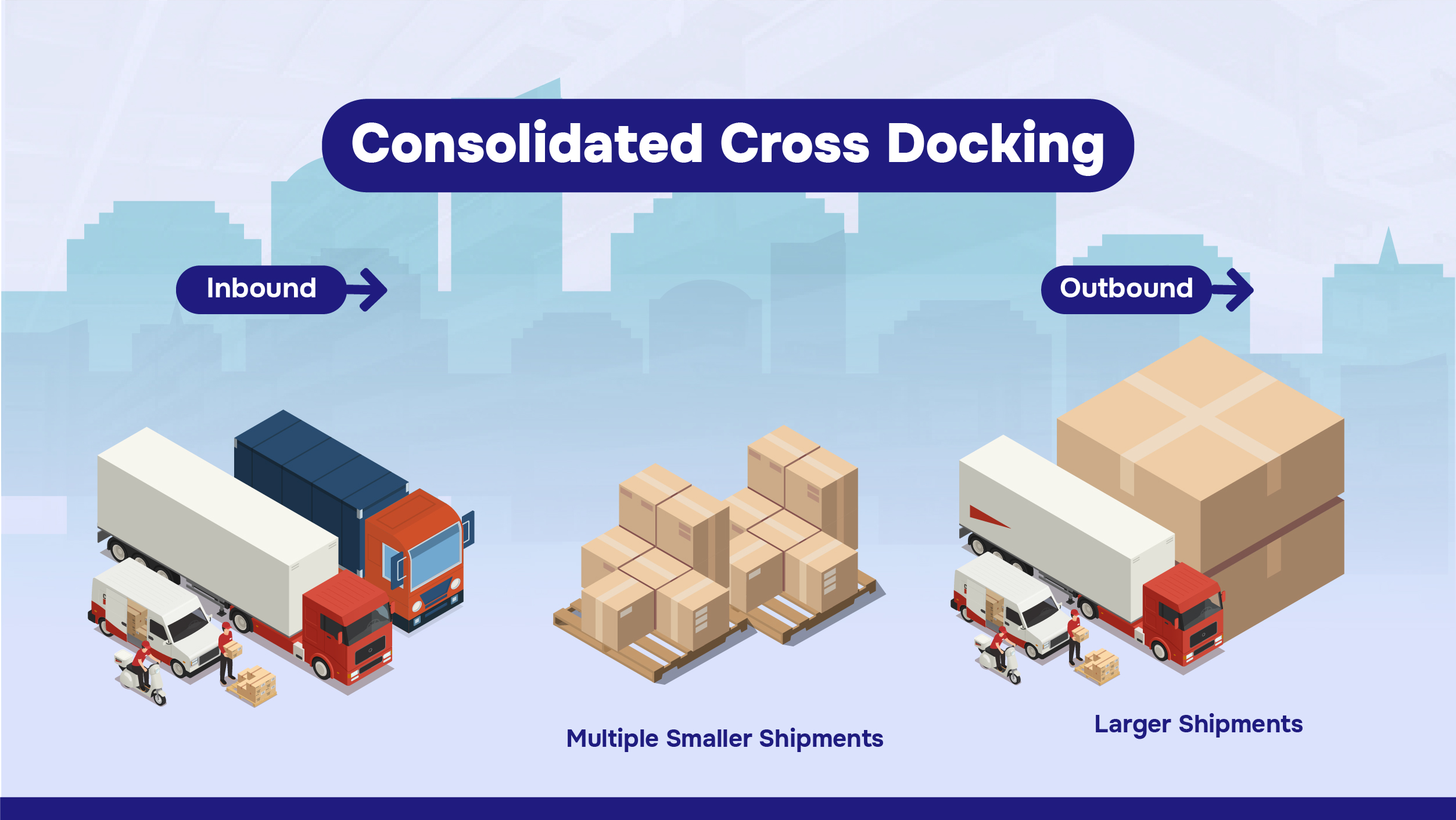 Consolidation cross docking involves combining multiple smaller shipments at a cross-docking facility to create one larger outbound load. It is a form of post distribution category of cross docking. This method requires goods to be efficiently warehoused at the facility then consolidating goods with other shipments destined for the same area and shipping the goods as full truckloads. The goal is to reduce transportation costs by optimising load capacity.