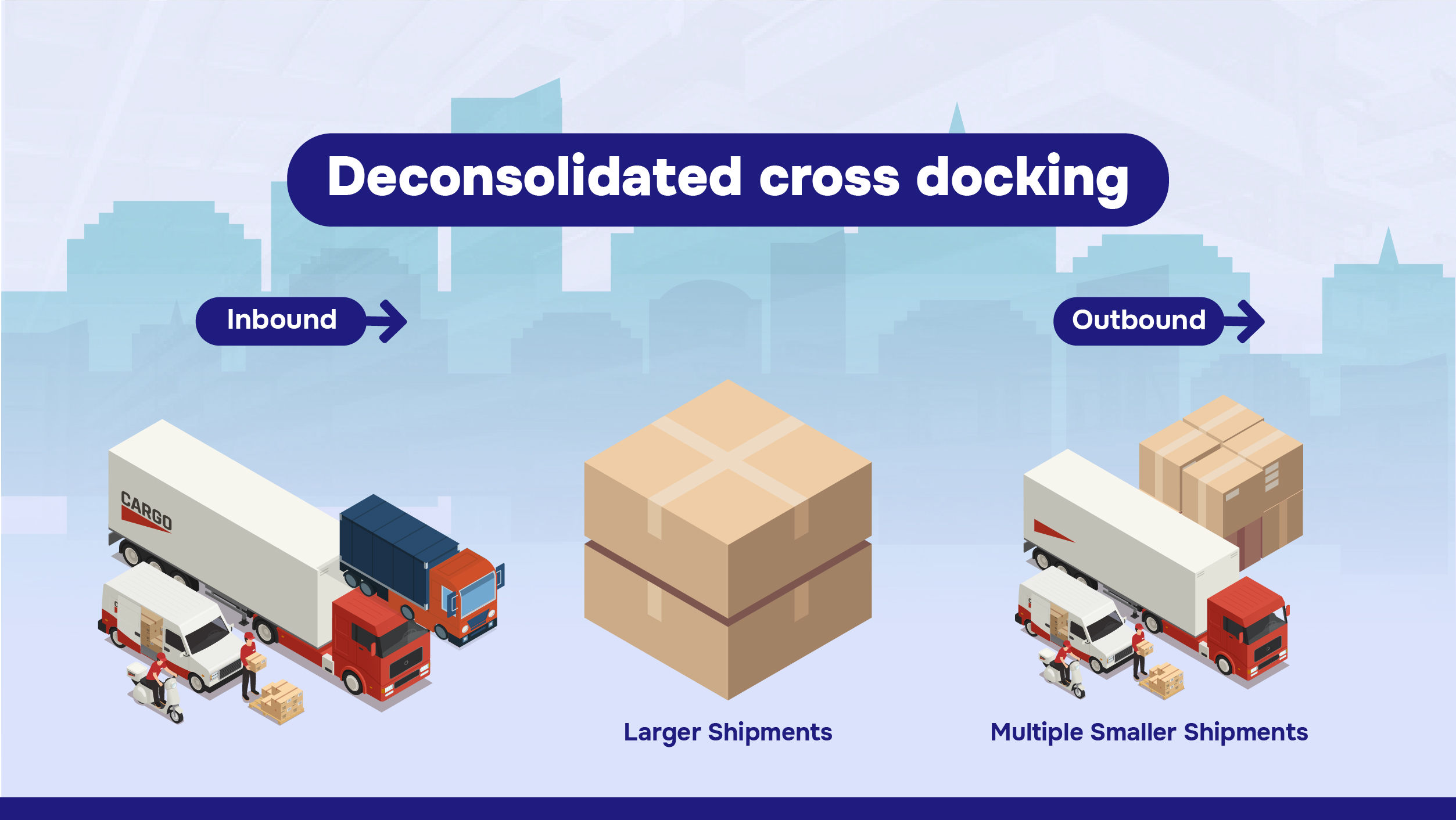 Deconsolidation cross docking is the opposite of the consolidation; this method involves breaking down large shipments into multiple smaller shipments. In this case, parcel carriers move goods across the country in a large shipment and split the shipment into smaller load for delivery to end customers.